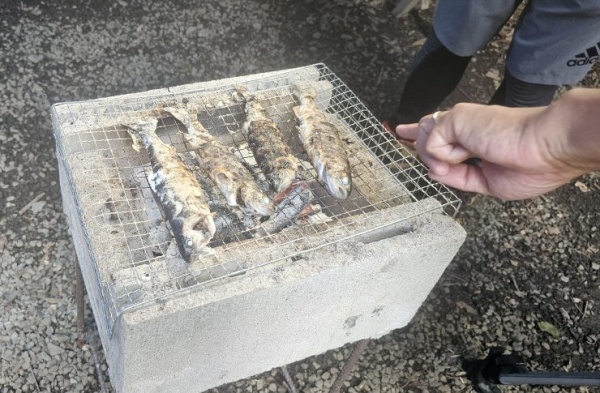 コンクリートで作った手づくりの炉で、ニジマスを塩焼きにします。まわりが熱くなりにくく、さわってもやけどしにくいから安心。大人といっしょに見ながら、魚が焼けるようすを楽しく学べます。自分でとった魚を食べるって生き物を食べる大切さもわかるよ…