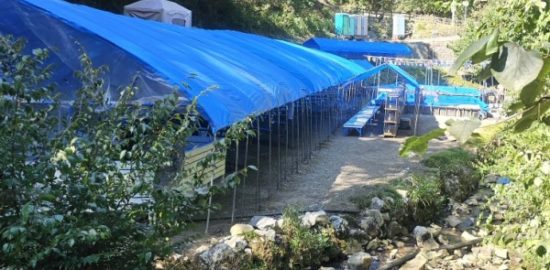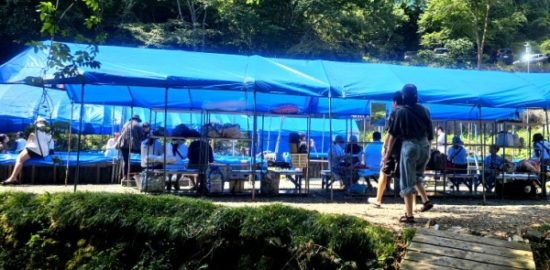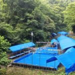 食事場から一望する流しそうめんと天然水プール。簡易トイレ。