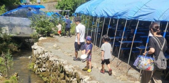食事スペースのすぐ横を通って、流しそうめん会場へ向かう道の様子です。川沿いの道は自然を感じられ、…