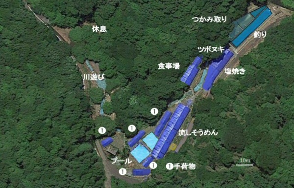 清流沿いに整備された自然体験型施設の全体配置を示しています。右上の「つかみ取り」「釣り」エリアでは、ニジマスを直接捕まえたり釣ったりする体験ができ、その下流側に「ツボヌキ」「塩焼き」と続くことから、捕った魚をその場で下処理し、焼いて…