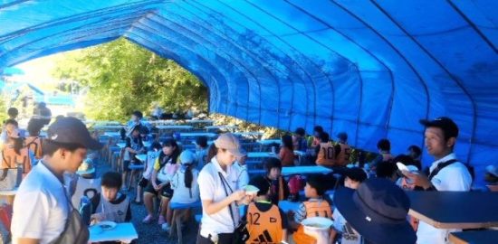 サッカークラブ。青空テントで楽しむ。流しそうめん食べ放題。