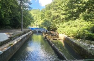 左手と右手前は釣り用。右奥二つはつかみ取り用の池です。山に囲まれ木々に覆われているため、強い日差しから守ってくれます。朝の静寂もつかの間、すぐに家族の嬌声が響き渡ります。家族で協力し、自然と触れ合いながら、思い出に残る一日を過ごせます。
