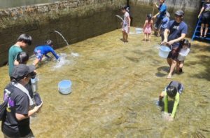 足首までの浅い水深に、ひんやりと冷たい清流が流れる特設の池。水に足を入れた瞬間、夏でも思わず声が出るほどの冷たさが伝わってきます。参加者は板を使ってコーナーへと魚を追い込み、素早い動きのニジマスをつかみ取ります。手のひらをすり抜ける魚の力強さや、ぬるりとした独特の感触に、子どもも大人も夢中。最初は戸惑いながらも、声を掛け合い協力するうちにコツをつかみ、見事に捕まえた瞬間には大きな歓声が上がります。自然の水の冷たさ、生き物に直接触れる体験は、普段の生活では味わえない貴重な学びと感動を与えてくれます。家族や仲間と一緒に、笑顔と達成感あふれるひとときを過ごせる体験です。