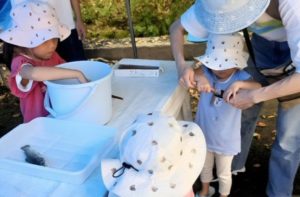 ニジマスに、割りばしを使った「ツボヌキ」に挑戦しました。ツボヌキは魚のお腹を開かず、内臓を丁寧に取り出す下処理方法です。初めは戸惑いながらも、ママに教わり手を動かすうちに、魚の体の仕組みや命の重みを自然と感じ取っていきます。ただ食べるだけでなく、命をいただく過程を体験することで、食への感謝や関心が深まる貴重な食育のひとときとなりました。自然と向き合い、学びながら味わう体験は、心に残る思い出になります。