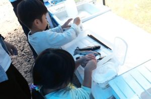 川沿いの屋外スペースで、獲れたてのニジマスを下処理する体験の様子。流し台は7台設置され、家族やグループが順番に魚を洗い、下処理後に塩をふって仕上げていく。子どもから大人まで安全に参加できる設備が整っている。自然の中で食の大切さを学び、調理前の工程を実体験できるプログラムは、アウトドア初心者にも好評。週末のレジャーや学習体験としてもおすすめ。
