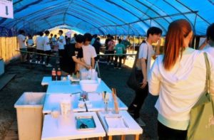 合宿中の大学生の団体が利用する流しそうめんの様子。テーブルには沢山のそうめんの準備が整い、参加者たちは懸命に箸を伸ばしている。食べ放題のため、笑顔と会話が絶えず、自然と新たな交流が生まれるのが印象的だ。夏らしい開放感の中で、仲間と食を共有する楽しさや、学生イベントならではの活気が伝わってくる。