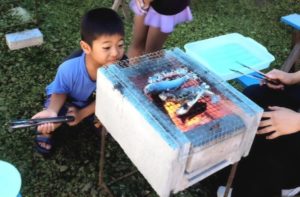 手作りの炉に炭火を起こし、網の上でニジマスの塩焼きを楽しむ場面。火の強さや皮の色を確かめながら、焼け具合を慎重に確認している。自分のものではない他人の魚でも、香ばしい匂いと音に引き寄せられ、思わず身を乗り出す子供。食への純粋な好奇心が伝わる一瞬を切り取った。子どもの視線の先には、焼き色が少しずつ変わる魚と揺らめく炎があり、魚を焼くことを体験する貴重な時間。