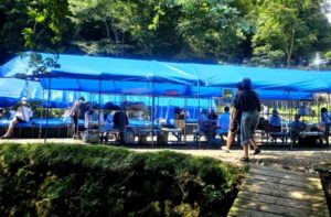木々に囲まれた自然豊かな場所に設けられたプールサイドの全景。青いテントの下にはテーブルやワイドベンチが並び、家族連れや来場者が思い思いに過ごしています。公園の橋から続く動線も分かりやすく、初めてでも安心。自然の涼しさと人のにぎわいが調和した一枚です。