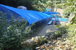 食事場の席から見渡せるのは、左手のテントの流しそうめん場と青く輝くプール。すぐ近くには簡易トイレも設置され、家族連れでも安心して過ごせます。山の緑に囲まれた開放的な空間で、子どもたちは遊び、大人は見守りやすいのも魅力です。自然の中で一日ゆったり過ごせます。