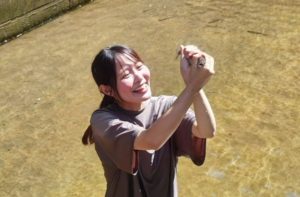 冷たい水の中で元気に泳ぐニジマスを、素手で追いかけてつかみ取る人気体験。子供たちの助けもあり見事ゲット。収録中のカメラマンや音声さんや来場者たちみんなから拍手が沸き起こりました。体を張っての体験報道の姿勢に感動を覚えました。