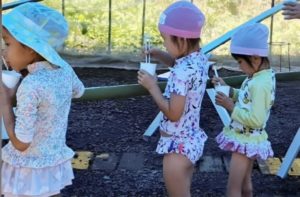 流しそうめんは食べ放題なんだけど、プールが気になって仕方ない。セルフでそうめんを食べることで、食べ物の大切さや感謝の気持ちを自然に学べます。プールの水は冷たいので濡れたら寒いからプール遊びの前に、流しそうめんを食べてほしい。