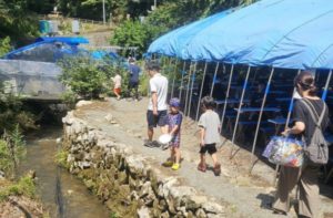 食事スペースのすぐ横を通って、流しそうめん会場へ向かう道の様子です。川沿いの道は自然を感じられ、歩いているだけでもワクワク。子供たちにとっては会場内すべてが冒険です。家族がこれから行う流しそうめんを楽しみに進んでいます。そうめん場までの道順が分かりやすく、家族連れでも安心。食事と遊び心が楽しくてたまりません。