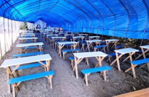 青いテントの下に整然と並ぶテーブルとベンチが特徴の食事場です。大人数でも同時に利用でき、雨や日差しを避けながらゆっくり食事が可能。昼食や休憩に便利で、家族連れや団体にも使いやすい設計。動線が広く、快適さを重視した場です。初めてでも安心して利用できます。