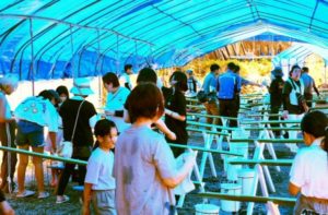 お昼の時間になると、多くの人でいっぱいになる流しそうめん会場です。ずらりと並ぶ23本の竹樋が同時に使われ、回転もよく待ち時間が少ないのが特長。家族連れや団体も一緒に楽しめ、活気ある雰囲気が広がります。写真からも分かるように、にぎやかさと整った運営で、昼時でもスムーズ。夏イベントの食事スポットとして人気が高く、たくさんの笑顔が集まる場所です。