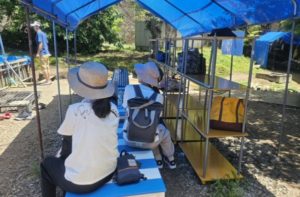プールのすぐ横に、広いワイドベンチと手荷物用の棚があります。遊んだあとに座って休んだり、かばんを置いて着替えの準備ができます。屋根があるので日差しも安心。友だちや家族と待ち合わせしやすく、中学生でも使いやすい休憩スペースです。落ち着いて利用できます。安全に配慮されています。とても便利な場所ですよ