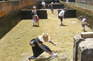 バケツの中のニジマスを見つめる子どもや、必死に捕まえようとするママ。つかみ取りは捕獲できないと食べられないため、大人も本気。浅瀬で安全に楽しめ、親子で協力する姿が特徴的な夏の人気体験イベントです。思い出の写真撮るためにスマホ手持ちだが水の中に落とさないでね。