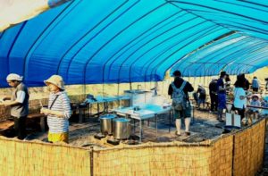 青いテントの下で、そうめんをゆでる専用の場所です。大きな鍋とガスコンロが並び、家族や仲間が順番に作業します。外でも安全に調理でき、出来たてをすぐ味わえるのが魅力です。夏の暑さの中でも風通しが良く、準備から片付けまで見渡せます。イベントや体験に向いた開放的な調理風景です。初心者も安心です。