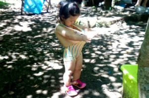 川遊びで初めての水着。おむつを探している様子がほほえましい。川遊びは、清らかで冷たい小川に足を浸し、自然を全身で感じます。透明な水の流れや石の感触、涼しい空気が心を癒やします。夏でも水はひんやりとしており、暑さを忘れさせてくれます。初めての体験でしたが、浅く流れの穏やかな場所を選び、パパとママが一緒に遊びました。