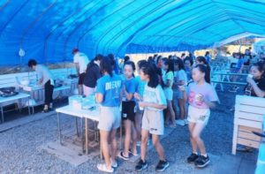 ダンスクラブの子どもたちが流しそうめんを楽しむ夏イベントの様子です。活動の合間にみんなで並び、そうめんを食べながら交流。食べ放題で待ち時間も少なく、25本竹樋があるので団体利用でもスムーズです。屋根付きで暑さ対策も安心。写真からは元気な雰囲気が伝わり、クラブやチームでの利用におすすめの体験スポットとして紹介できます。
