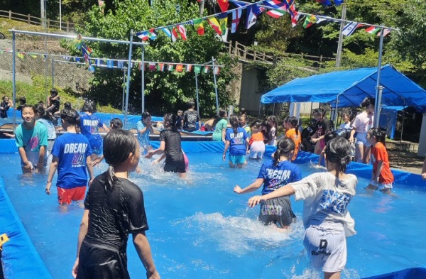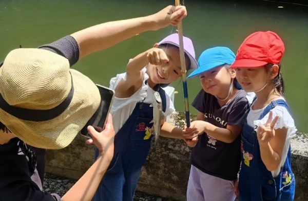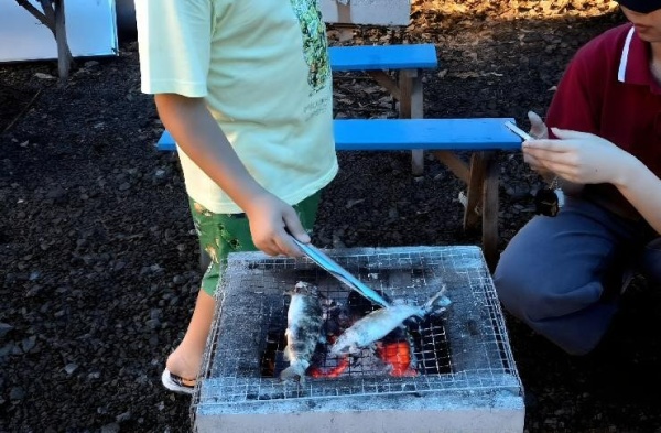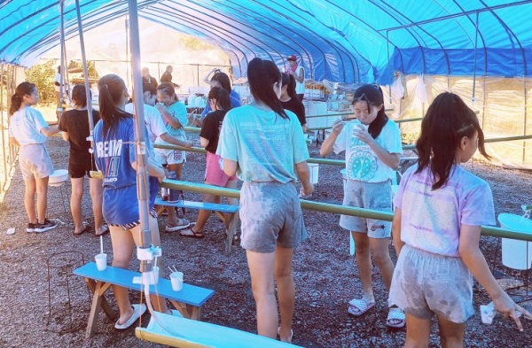 岩山に囲まれ、木陰が心地よいニジマス池。澄んだ冷たい水の中を元気に泳ぐ魚たちを前に、子どもたちは真剣な表情で釣り糸を垂らします。初めて竿を握る子も多く、パパに教わりながら挑戦。水の冷たさや魚の力強い引きを体感することで、自然の恵みや命の大切さを学ぶ食育の場にもなっています。釣ったニジマスを間近で観察する時間は、図鑑では得られない貴重な学び。木々に囲まれた静かな環境の中で、家族や仲間と過ごすひとときは、五感を使った自然体験として心に残ります。都会では味わえない清流の雰囲気と、岩肌を伝う涼やかな空気が、訪れる人をやさしく包み込みます。