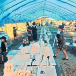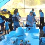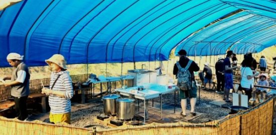 青いテントの下で、そうめんをゆでる専用の場所です。大きな鍋とガスコンロが並び、家族や仲間が順番に…